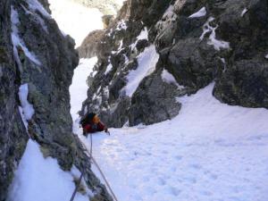 El corredor amb neu bona, i els tres ressalts formats. Els dos primers són molt curts i seguits, i abans del tercer hi ha una balma, a la dreta, amb una reunió preparada. El tercer és el més llarg i el més espectacular, amb una capa de gel.Després del tercer, és ja una rampa que et deixa uns quants metres a la dreta del cim.