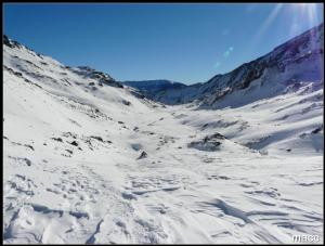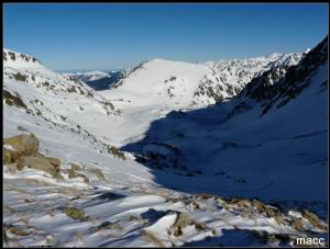 Nieve continua desde la misma carretera en el pueblo de Hospitalet-pres-l'Andorre a 1400 metros, bastante blanda desde primera hora de la mañana, incluso con raquetas nos hundíamos, a medida que subíamos las condiciones de la nieve mejoraban algo, pero seguía estando bastante fofa, solo en la subida a la Portella de Siscar las condiciones eran muy buenas para raquetear, de la Portella a la cima bastante pelado, el viento del norte a causado estragos, pequeñas placas de hielo sin importancia, subimos sin sacar los crampones. Regreso a la Portella y bajada por l'estany de Pedourres y la vall d'Arques, mejorando en esta vertiente las condiciones, bajamos la mitad del camino sin raquetas, a medida que bajábamos la nieve se ponía mas blanda y nos las tuvimos que volver a calzar, la parte final un sin vivir, nos hundíamos hasta la rodilla.