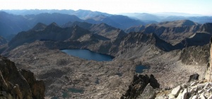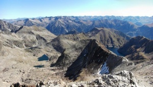 Des del coll de Ballibierna els estanys i la vall d'idem. Al fons el Posets treu el cap i ens saluda.