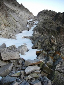 Pujant per la canal sud, amb els colls de Ballibierna i dels bucardos gairebé alineats.