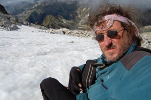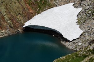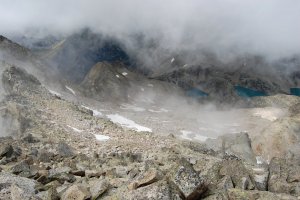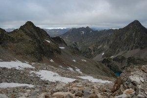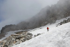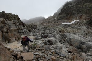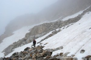 Hartos de piedras, bajamos por los escasos neveros tirando de crampones, que para eso los hemos cargado... La nieve está durísima, lo normal para estos neveros residuales de verano.