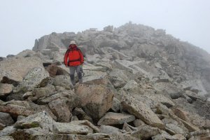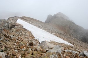 Nos tiramos una hora en la cima oriental por si la nube tozuda levantara... En fin, aquí estamos empezando a volver, con el mojón cimero detrás de Pep.