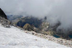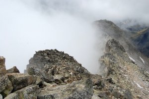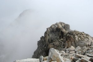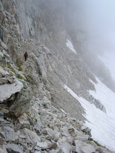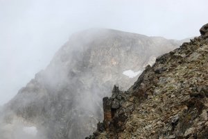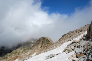 Cuando acabamos de empezar a bajar, la nube parece levantarse y volvemos casi hasta la cima central. Aquí, lo que se ve de la parte occidental de la cresta cimera, con la Frondiella occidental al fondo.