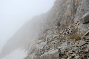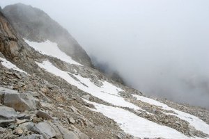 La nube ya nos engulle en la zona alta del flanco, a unos 2.800... Al fondo aún podemos intuir el ángulo sureste de esta vertiente, donde está el paso clave para encaramarse a la zona de cimas.