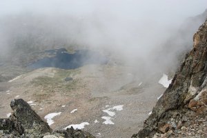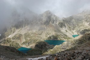 Destellos puntuales de sol... Abajo a la derecha, el ibón bajo de Arriel, donde tenemos la tienda.