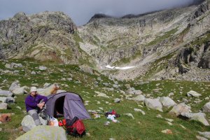 Nuestra instalación, y al fondo el flanco noroeste de las Frondiellas por donde subiremos al día siguiente.