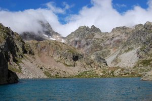 Aquí lo tenemos, a 2.100 más o menos. Al fondo, los efectos de la famosa máquina de nubes de los franceses, medio ocultando entre otras cosas la imponente pirámide rocosa del Pallas, a la izquierda.