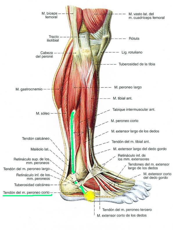 - Rotura del tendón peroneo corto: esto es lo que creían que me pasaba, que el tendoncillo este se había soltado del hueso del dedo chico (a la altura de la mitad del pie). Unas veces se suelta solo, y alomejor en unas 6 semanas se vuelve a unir con suerte, pero generalmente hay que operar (y ya sabemos que tras una operación el cuerpo ya no es el mismo). Otras veces el tendón se contrae arrancando un cacho de hueso. Se puede dar por 40.000 cosas, pero algunas de ellas son....el mismo movimiento que un esguince de tobillo pero lo que se suelta es este tendón, o un movimiento continuado de contracción-estiramiento de dicho músculo que al final..."gripa".