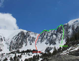 Merece mucho la pena la combinación, aproximación dura abriendo toda la huella, el corredor muy bonito y fácil, PD+ con buena nieve, y la esquiada desde la cima con una nieve cremita memorable si no es por el armario que llevábamos a la espalda. Lamentablemente en la parte final de la esquiada y con una nieve pesadilla en un mal giro María se lesiono… rotura de tibia… a descenderla con ayuda, llamar al pájaro y al hospital.