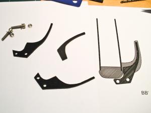 -Las 3 pletinas, cortadas a mano con bisturí (en PVC espumado de 2mm, las piezas reales serán de aluminio).