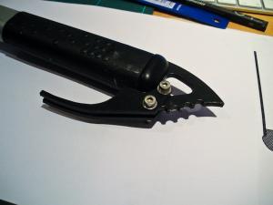 Aprovechando la geometría del regatón, con 2 tornillos (M4) se puede fijar un buen soporte. El alma del grip serían 2 pletinas, a los laterales del regatón, de 2 mm. Otra pletina central, del mismo ancho que el regatón (4.5mm), seguiría la misma forma y se apoyaría en el saliente superior del regatón (encima de los "dientes").