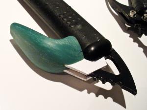 -El master que utilizaré para la colada, tallado a mano en cera de modelado. Los 2 postizos que tiene son de PVC espumado de 2 mm. La zona donde toca con el mango se tiene que afinar, la separación es muy grande (pifia mía al hacer el modelo).