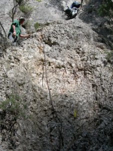 Pas més llarg del pas, uns 15-20m verticals, ben equipats amb grapes i cadenes (VF)