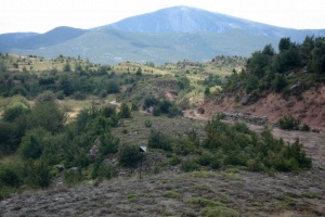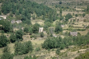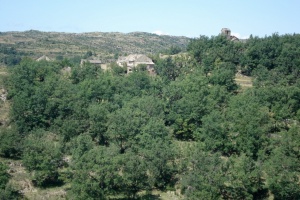 Tozal de Guara (cara norte) y campos de Otín abandonados y empezando a ser colonizados por los árboles.