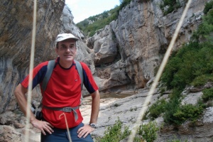 Tres barranquistas rapelando en el barranco de Otín