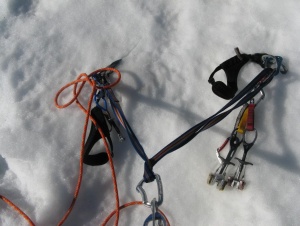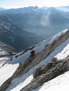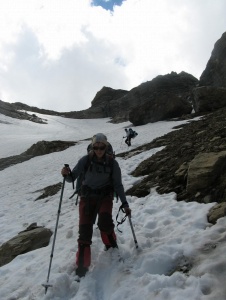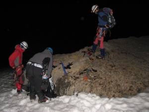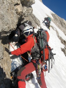 Loybcn y Alba preparando su reunión para afrontar el resalte. Detrás se ve un escalador subiendo por la pala de la derecha que permitía evitar el resalte rocoso
