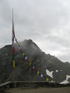 Banderas de oración en la terraza del refugio Guggliemina