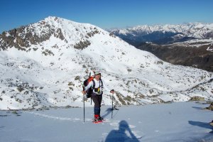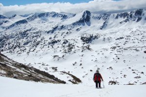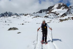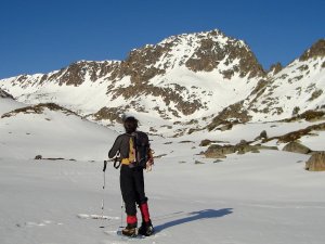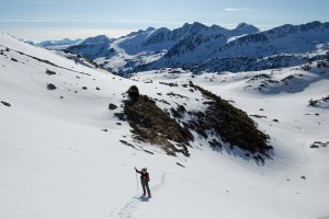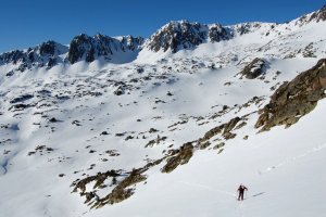 Anem entrant en la petita conca allargada de llacs que hi ha al nord de l'ampli circ dels Pessons. La neu està fumuda...
