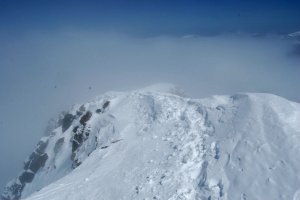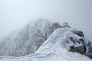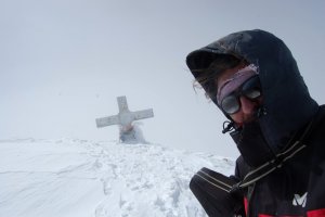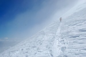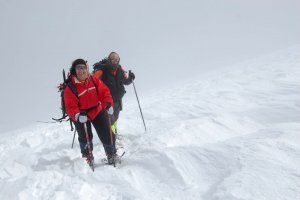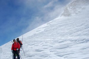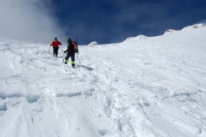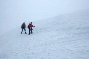 Carmen y Antonio remontando las palas finales bajo la antecima, en medio de la nube y la ventolera.