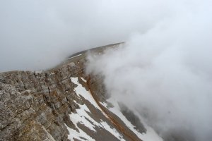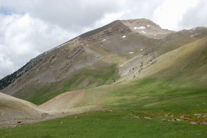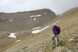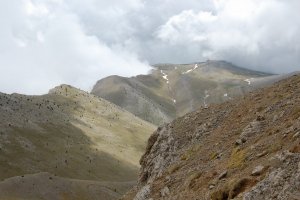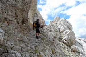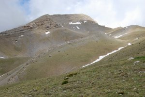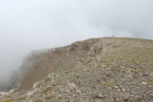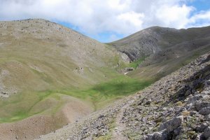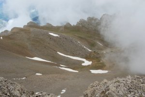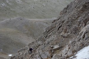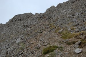 Entrant al petit circ al peu del cim, que franquejem cap amunt i a l'esquerra, com es veu en les traces a la tartera. És l'unic sector realment pendent de l'ascensió.