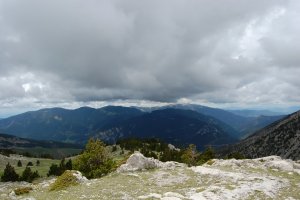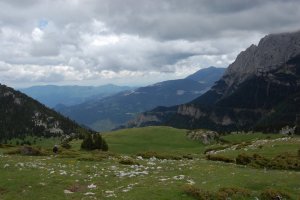 Vistes cap al nordest, el cirquet des del qual hem pujat, amb les puntes de la serra dels Cortils al fons.