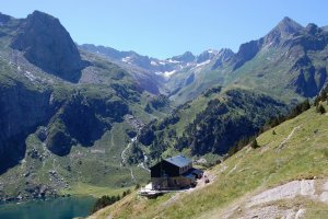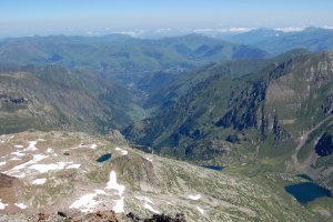 Y a norte total, el valle de Oô: en el centro, las campas de las granjas de Astau, donde tenemos el coche, y abajo a la derecha, cerca del lago, el refugio de Espingo.