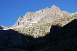 El domingo 18 sí, de verdad. El circo de Espingo, y a la derecha, soleado, el Spijeoles, nuestro objetivo, visto desde el norte. La normal gana el amplio collado y llega al pico por detrás, por el sur.