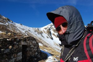 Aquí al costat hi ha una petita cabana on ens vam poder protegir una bona estona. Per cert, la neu que s'ha colat darrerament al seu interior impedeix totalment obrir la porta i entrar-hi.