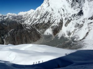 Nuestras sombras caminando por la sombra de la arista cimera del Island Peak con el Cho Oyu al fondo