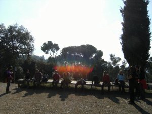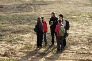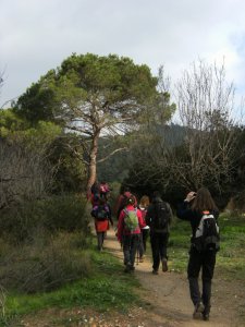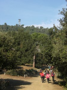 Saliendo de Can Rabella hacía Les Escletxes. Delante Ana, Piluca y Anna. al fondo Collserola.