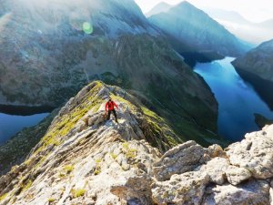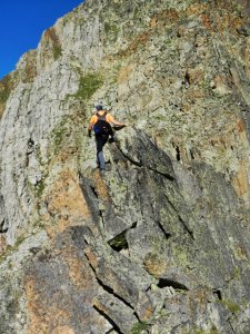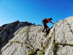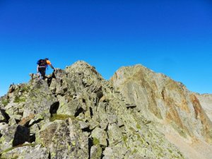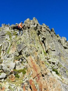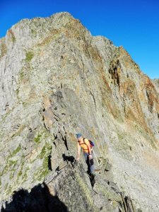 A punt d'entrar a la primera desgrimpada (I+). Es veu la secció més aèria de la cresta, en particular les dues agulles