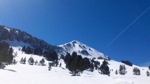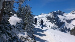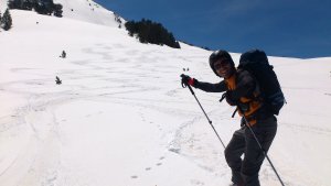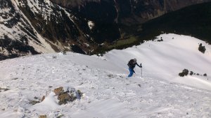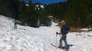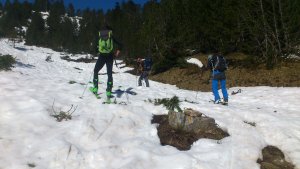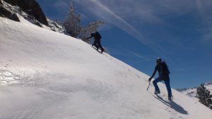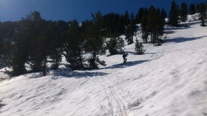 Nos calzamos los esquis ya a los 1800m. De subida nos tenemos que poner las cuchillas en el tramo final antes del collado para coger la subida por la norte.