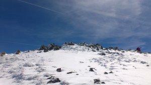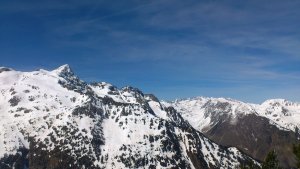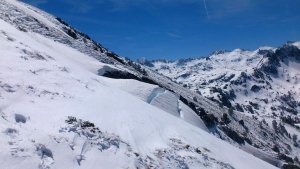 Para tirarse desde la cima la cosa estaba bastante delicada. Solo salir a Alberto se le rompe una placa de nieve, pero ya después de esto, un poco de bajada de lado haciendo escalerita y un flanqueo para buscar por donde bajar, nos comenta que la nieve estaba perfecta.... yo no queria ni mirar :S