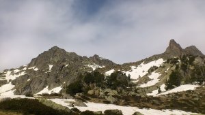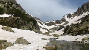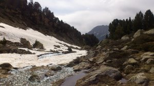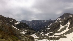 Dilluns, o sigui avuí, com al final Dave i Speakbow no podien pujar, decidim quedar-nos al mateix lloc i volem fer el Pic de Bergús, al costat del Ratera. Hem sortit més o menys igual que diumenge, i semblava que faria encara més calor i menys vent.... dons no... un cop passat l'estany de Ratera, el dia s'ha començat a tapar, el vent a bufar més fort... fins que a l'alçada del Estany del Port de Ratera ja començava a ploure i el vent s'ha tornat un huracà!! ... mitja volta i cap a la furgo :p En aquesta vall trobem una mica més de neu i sobre els 2200 hi ha més que ahir.