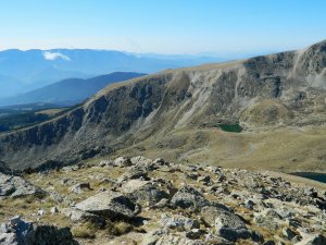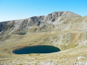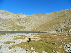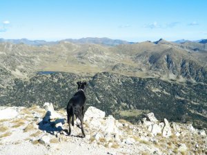 I pujant al Coll de La Muga, en baix l'estany i al fons la Tossa Plana de Lles.