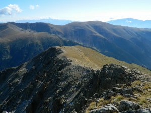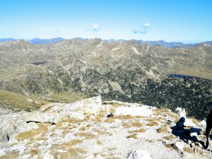 A sudoest, el perfil del vessant meridional de la Tossa Plana i el Cadi al fons. A l'esquerra del tot, a meitat de la foto, es pot veure Cap de Rec, d'on hem sortit, a uns 9 km. lluny... I queda tornar...