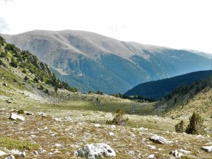 Anem entrant en la coma final dels estanys de La Muga, amb el nostre cim a dreta i el sector de la Tossa Plana a l'esquerra.