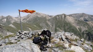 Hacia sudoeste la cadena que hemos recorrido desde el Fontlletera, la puntita casi en el centro, y a la derecha el Balandrau. Plom aparece tirado en la hierba, ha llegado casi arrastrándose...
