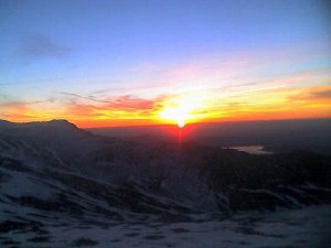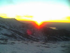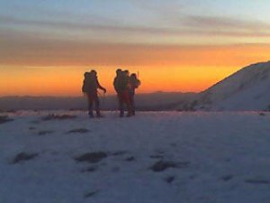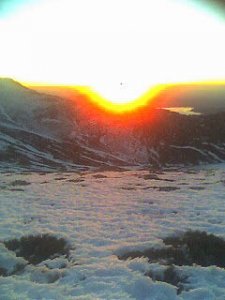 nosotros apenas encendimos los frontales, pero al fondo apareció uno que venía bien armao. Será el nuevo Petzl de diodo solar