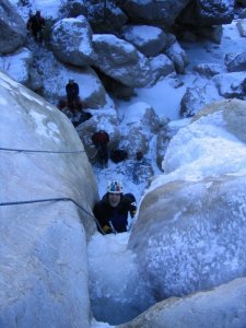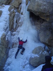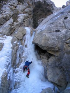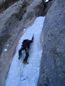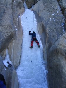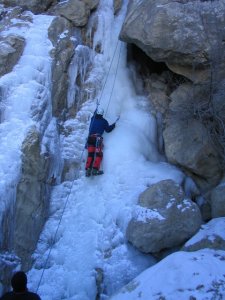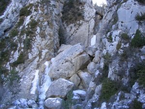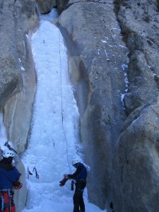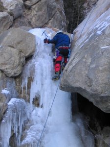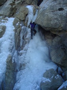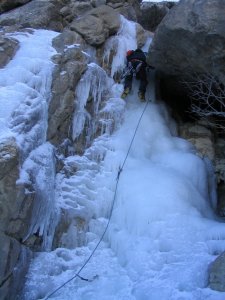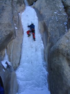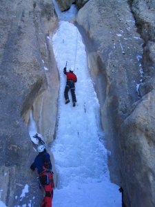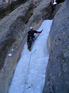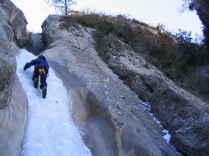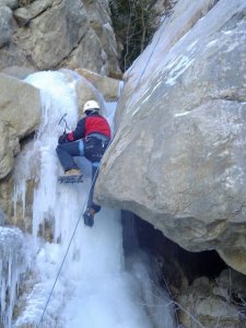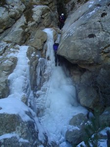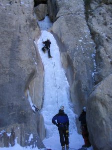 Hielo en el Torrent del Forat Negre, en Vallcebre. Son unas cascadas que se forman muy ocasionalmente y que pudimos hacer gracias a la ola de frio siberiano que nos invadió a finales de enero. Concretamente el 29 de enero del 2005.