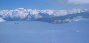 increíble cantidad de nieve sobre la pista a 1300m de altura. Al fondo, parte de la Serra Cavallera que crestearemos...