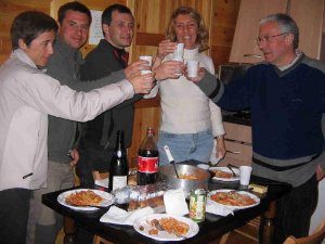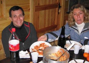 Nicky sirviendo la cena ( cebolla con macarrones ) junto a Waldo y Tonimd. No faltan las olivas... ( no las he traído yo )