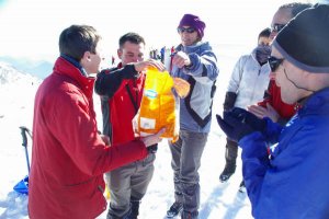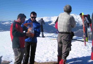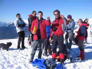 Eduard con el cava, Jam con los Ferrero Rocher, Zodiaco con las palomitas, y Waldo con los minitoblerones, en la cima del Taga. Nicky almorzando junto al termo de infusión, y el trípode de Javier