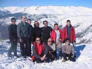 el grupillo en la cima del Puig Estela, y al fondo las montañas de Núria y Coma de Vaca