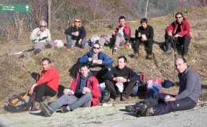 comiendo tirados en el suelo, al llegar a los coches. Arriba: Tonimd, Nicky , Jordi C, kris y Octane. Abajo: Jam, Zodiaco, Esunyen, Waldo y Pratenc