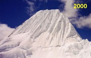 En Ranrapalca en 2000. Nótese la continuidad del glaciar de la pared NW (izquierda) y la extensión del glaciar del Ocshapalca (pico de la derecha)