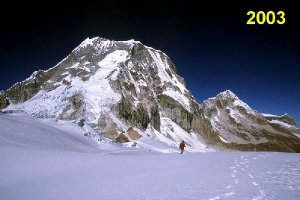 El Alpamayo de 2002. La rimaya de la base de la pared cada vez está más abierta.