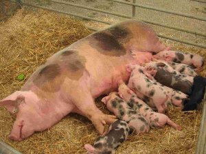 el día acaba en la feria de muestras de GRanollers. Once cerditos se alimentan de su madre, no hay tetas para todos. Al negro lo tienen excluido.