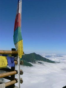 Banderas de oración del refugio y el Ceciré, con el mar de nubes por debajo