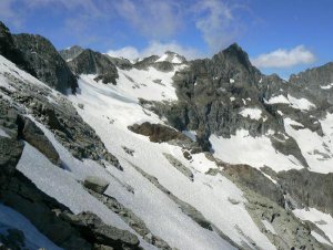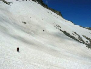 Maupas, poco antes de salir a la cima de la Tusse de Maupas. En la zona de la derecha por encima del nevero es donde se encuentra el "mauvais pas", a la salida del mismo